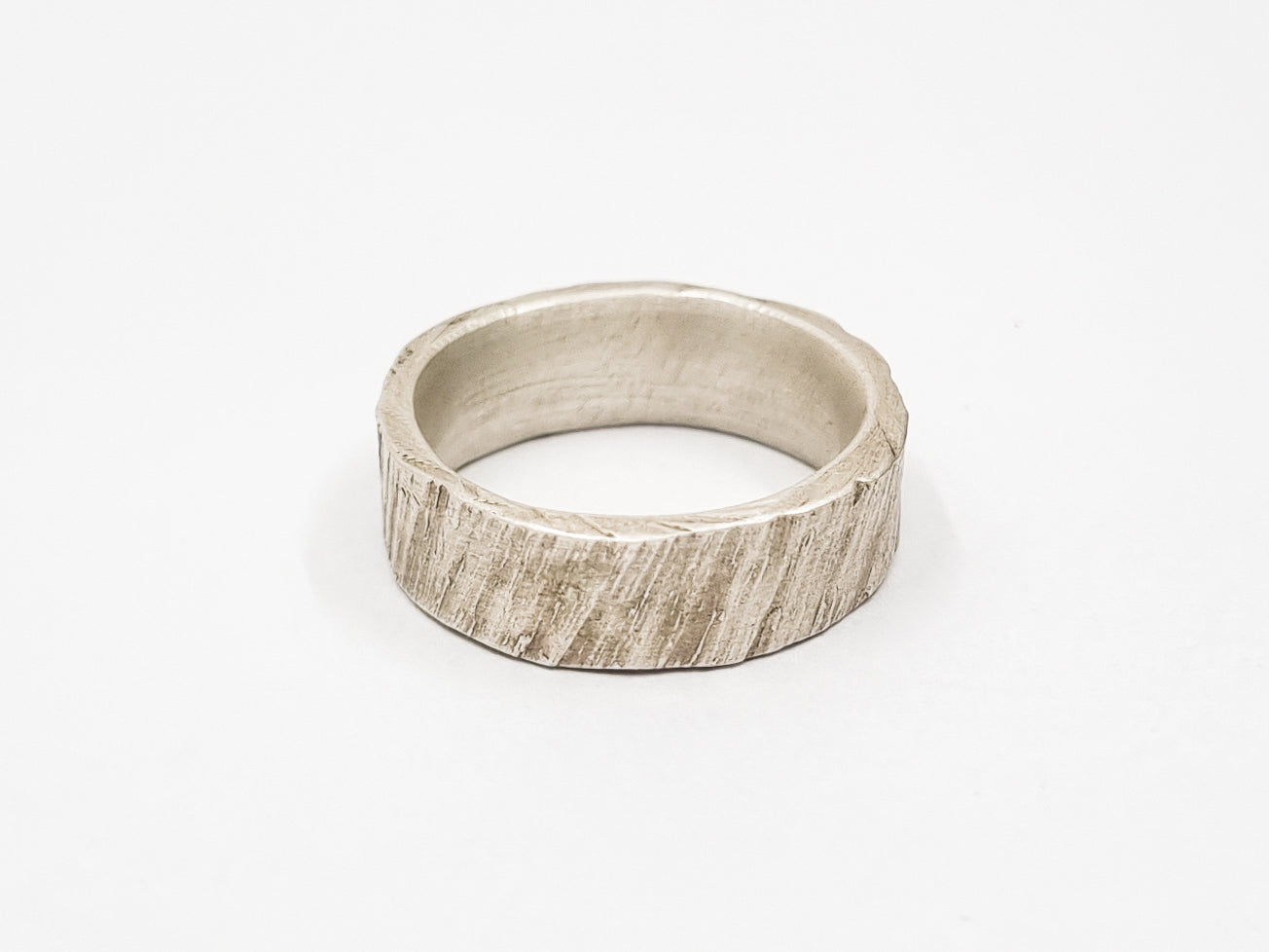 Ein Ring mit Charakter: Dieser Silberring lebt von seiner rauen, gesägten Oberfläche und dem spannenden Kontrast zur glatt polierten Innenseite. Jeder Schnitt, jede Linie ist ein Abdruck des handwerklichen Prozesses – nichts wirkt glattgebügelt, sondern authentisch, archaisch und voller Ausdruckskraft.