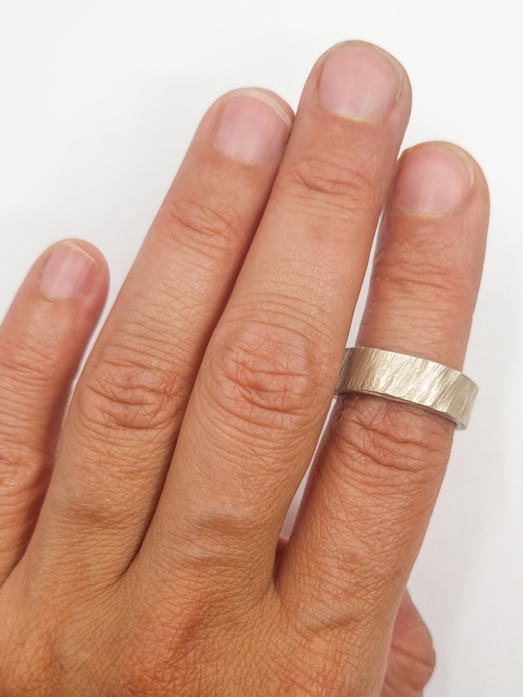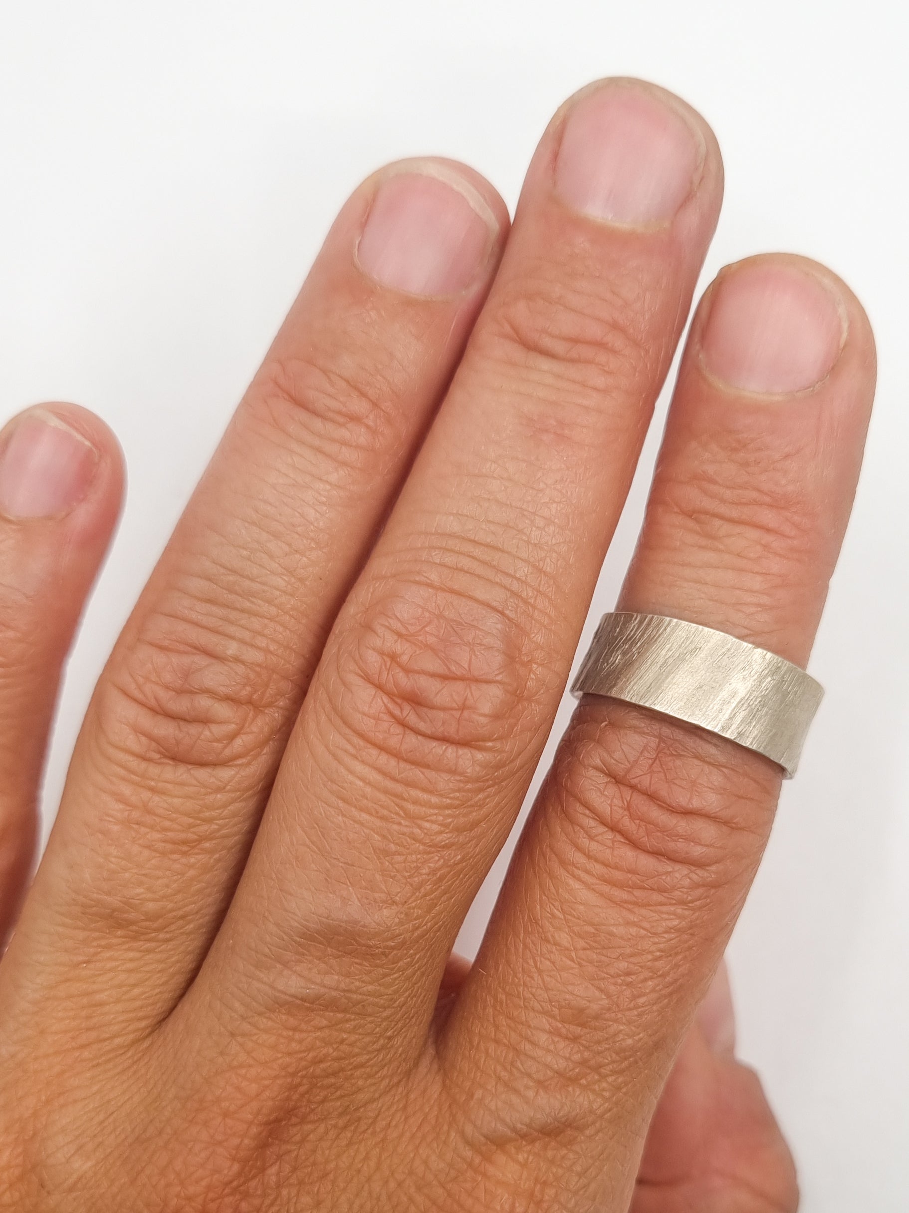 Ich fertige diesen Ring in meinem Ein-Frau-Atelier in Berlin. Jedes Stück entsteht in Handarbeit – deshalb gleicht kein Ring dem anderen. Struktur und Breite variieren leicht, was jedem Exemplar seine ganz eigene Persönlichkeit verleiht.